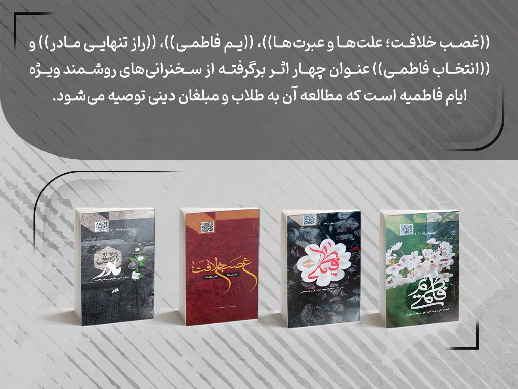 به گزارش پژوهشکده تبلیغ و مطالعات اسلامی باقرالعلوم علیهالسلام، چهار اثر «غصب خلافت؛ علتها و عبرتها»، «یم فاطمی»، «راز تنهایی مادر» و «انتخاب فاطمی» به مناسبت ایام فاطمیه و با محوریت بررسی ابعاد شخصیتی و آموزههای حضرت فاطمه زهرا (سلامالله علیها) منتشر شده است.